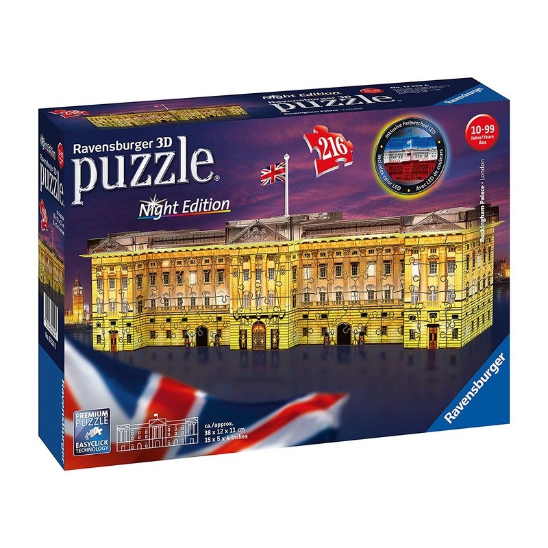 Az angol királyi család otthona, megvilágítva! A Buckingham palota fénnyel 216 darabos 3D puzzle a brit uralkodóház székhelye, kirakós változatban. Az épületet ragasztó nélkül, könnyedén össze lehet állítani, a mozaikdarabok hátlapja nyíllal és számokkal vannak jelölve, hogy könnyebb legyen kirakni. A palotát ki tudod világítani, a puzzle váltakozó fénnyel fog világítani a sötétben. A játék 3 darab AAA mikro ceruzaelemmel működik, a csomagolás az elemeket nem tartalmazza. A Buckingham palota fénnyel 216 darabos 3D puzzle kirakott méretei: 38 x 12 x 11 cm.
