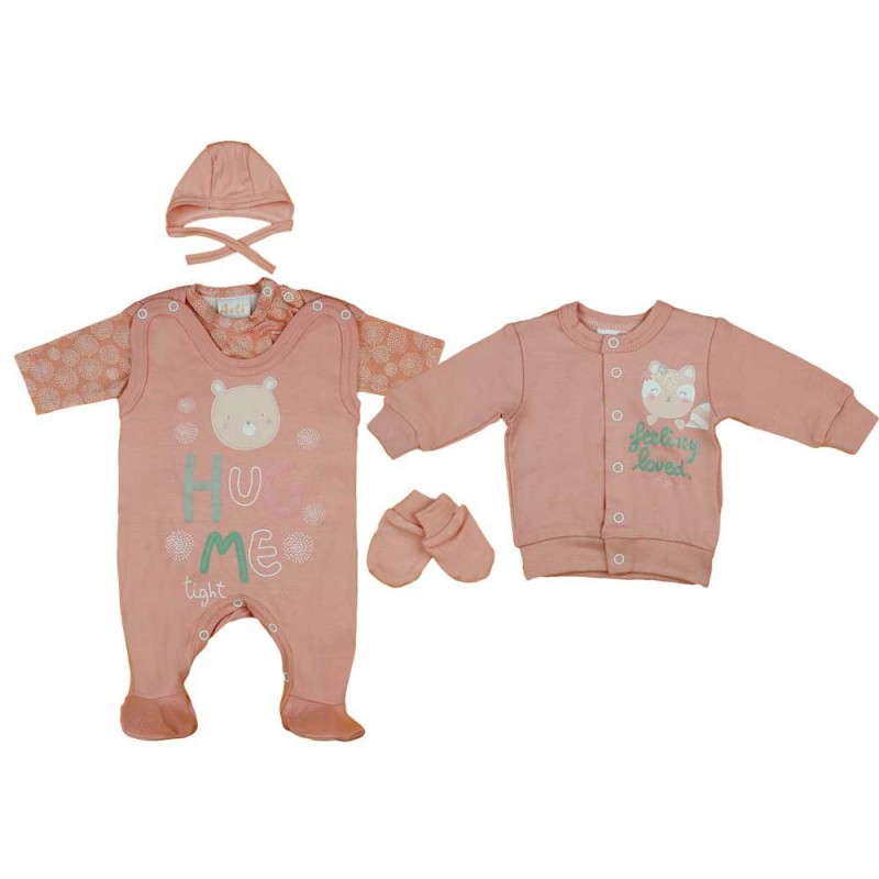 Légy elragadtatva ezzel a 5 részes baba szettel, amely cuki cicás mintával van díszítve! Az ujjatlan, vállon patentos rugdalózónk a cicás mintával garantáltan rabul ejti a kislányodat. Az elöl patentos kocsikabát kényelmes és praktikus viselet, amely bármilyen időjárásban megvédi a babát. A mintás hosszú ujjú, vállon patentos baba body puha anyagból készül, amely nem irritálja a baba bőrét. A szettben található baba sapka és kesztyű tökéletes kiegészítője a szettnek, és segít melegen tartani a babát a hideg hónapokban is. Minden darabja 100% pamutból készült, I. osztályú minőségben. Büszkén mondhatjuk, hogy termékeink magyarországi gyártásúak, az Andrea Kft. által készített. A termék nikkelmentes patenttal készül, így az erre érzékeny babák sem fognak allergiás reakciót tapasztalni.