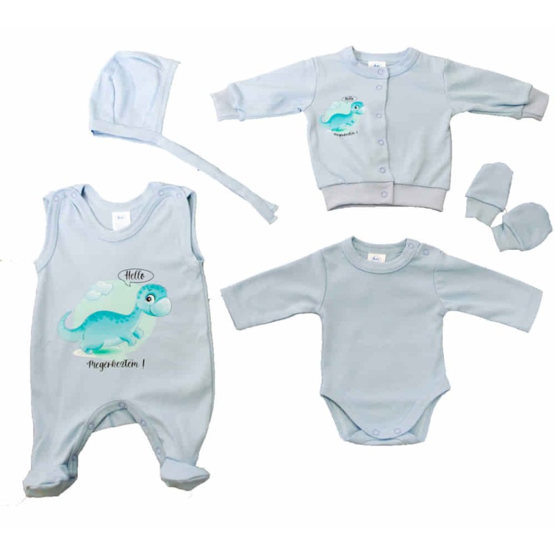 Az Ön kis dinója imádni fogja ezt a világoskék, 5 részes baba szettet dinós mintával, mely hazánkban készült, minőségi és 100% pamut anyagból. A szettben található egy cuki ujjatlan rugdalózó, melynek vállán praktikus patent segíti az öltöztetést, valamint a mintáját egy friss és vidám dinós minta díszíti. Ezenkívül a csomag tartalmaz egy kényelmes, hosszú ujjú bababody-t is, mely szintén vállon patentos kialakítású. Továbbá egy elöl patentos kocsikabátot is találunk a szettben, melyen szintén a vidám dinós minta kapott helyet. De a csomag még nem ért véget! Egy aranyos, szintén dinós mintával ellátott baba sapkát és egy pár babakesztyűt is talál benne, hogy a kicsi feje és keze is mindig meleg legyen. Az összes termékben nikkelmentes patentokat használtunk, így azok nem váltanak ki allergiás reakciókat az erre érzékeny babáknál. Válassza ezt a minőségi, I. osztályú magyar terméket, hogy babája mindig stílusos és kényelmes legyen!