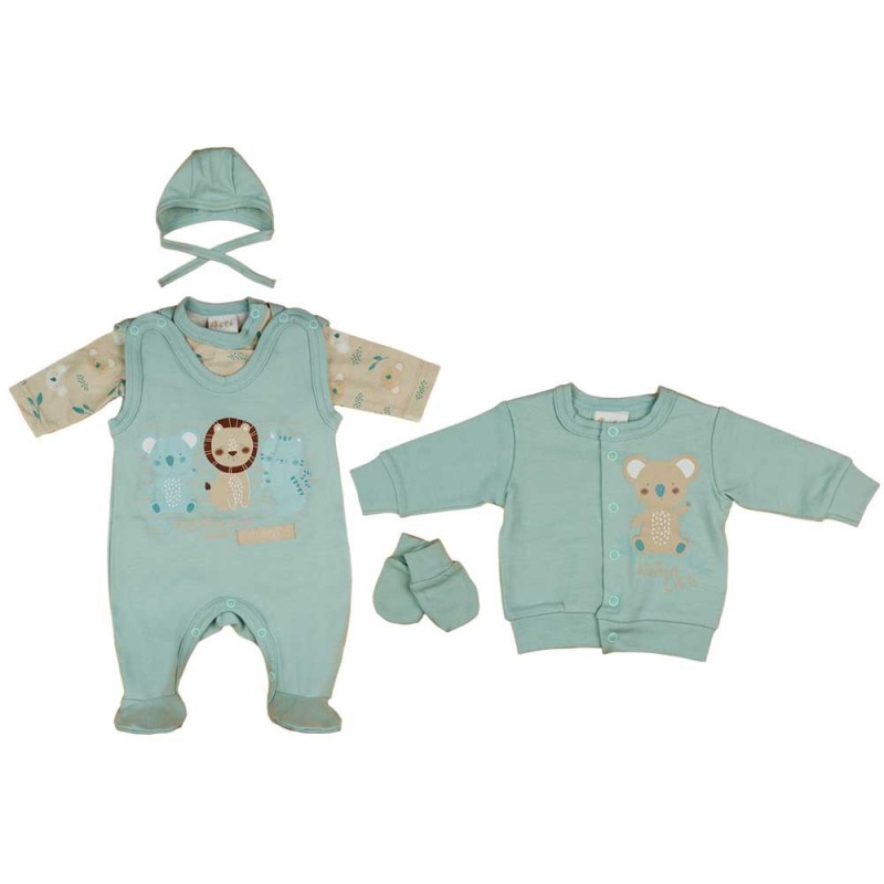Öltöztesd fel kisbabádat ezzel a varázslatos 5 részes baba szettel, ami a legaranyosabb koala mintákkal van díszítve! A szett tartalmaz egy ujjatlan rugdalózót, egy hosszú ujjú bodyt vállon patenttal, egy elöl patentos kocsikabátot, egy baba sapkát és egy baba kesztyűt. Minden darabja zöld színű és koalás mintájú, ami biztosan mosolyt csal mindenki arcára. A szett minden darabja 100% pamutból készült, így extra puha és kényelmes lesz a babád számára. A magas minőségű anyagok és a nikkelmentes patentok gondoskodnak róla, hogy baba bőre ne irritálódjon, még hosszabb viselés után sem. Mindezek mellett a termék Magyarországon készült, az Andrea Kft. gyártásában. Tedd boldoggá a babádat és öltöztesd fel őt ezzel a csodálatos baba szettel!