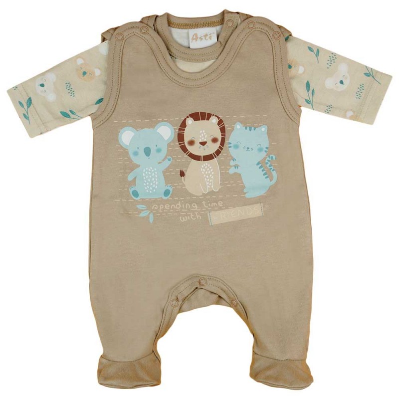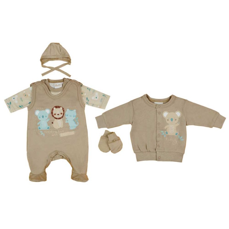 Kedves kisbabádnak szeretnél minőségi, mégis stílusos ruhákat? Akkor szeretettel ajánljuk ezt a 5 részes, koalás mintával díszített baba szettet! A szettben található egy ujjatlan rugdalózó, egy hosszú ujjú vállon patentos baba body, egy elöl patentos kocsikabát, egy baba sapka és egy baba kesztyű is. Minden darabon a cuki koala karakter jelenik meg, ami egyszerre játékos és divatos. A barna színű szett uniszex, így kisfiúknak és kislányoknak egyaránt tökéletes választás lehet. A termék Magyarországon készült, 100% pamut anyagból, mely garantálja a puhaságot és a tartósságot. Az I. osztályú minőség pedig biztosítja, hogy baba ruházatod hosszú ideig megőrizze szépségét és minőségét. A termék nikkelmentes patenttal készül, így azoknak a babáknak is biztonsággal használható, akik érzékenyek a nikkelre, és allergiás reakciót válthatna ki náluk. Válaszd ezt a szettet, ha szeretnéd, hogy babád mindig kényelmesen és stílusosan öltözködjön!