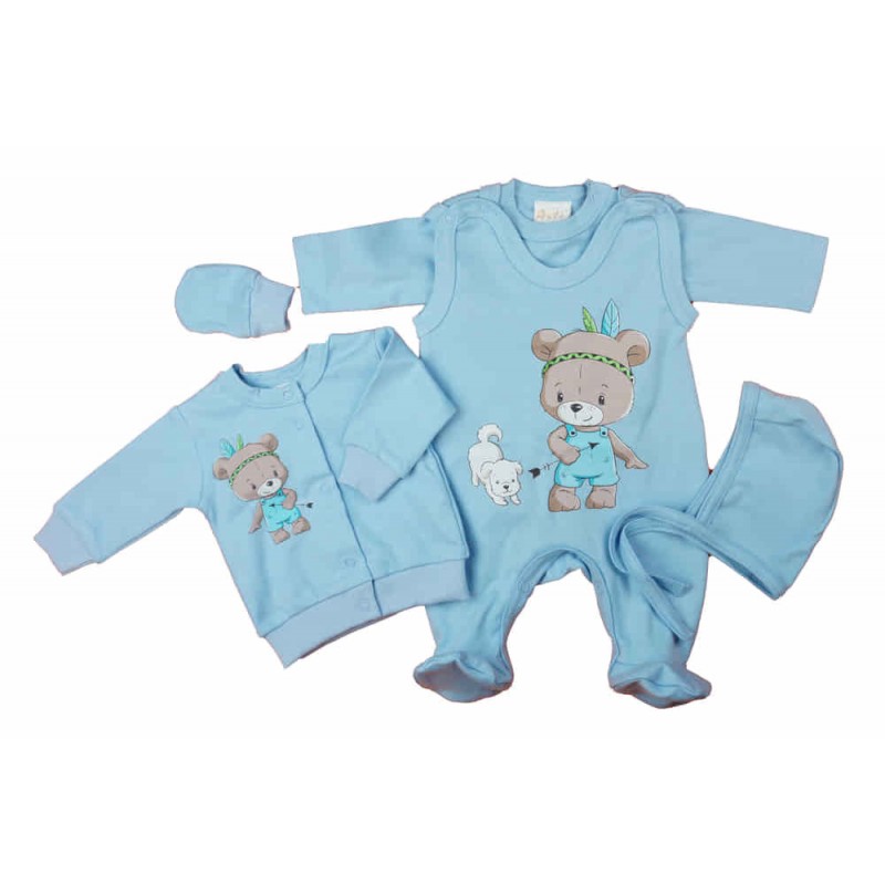 Szívdobogtatóan édes és kényelmes, ez a 5 részes baba szett, mely világoskék színben és macis mintával készült. Egyszerűen tökéletes választás a kicsi mindennapi ruhatárához. A szettben található egy ujjatlan, vállon patentos rugdalózó, egy elöl patentos kocsikabát, egy hosszú ujjú, vállon patentos baba body, egy baba sapka és egy baba kesztyű. Minden darabja 100% pamutból készült, mely puha, légáteresztő és kényelmes viselet a baba érzékeny bőrének. Az I. osztályú minőség garantálja, hogy a ruhák nem fakulnak, nem nyúlnak és nem veszítik el formájukat, még sok mosás után sem. A szett Magyarországon készült, és büszkén mondhatjuk, hogy ez egy minőségi magyar termék. A nikkelmentes patentok pedig gondoskodnak róla, hogy baba bőre biztonságban legyen, és elkerülje az allergiás reakciókat. Ezzel a szettel a baba nem csak jól fog kinézni, de jól is fogja érezni magát!