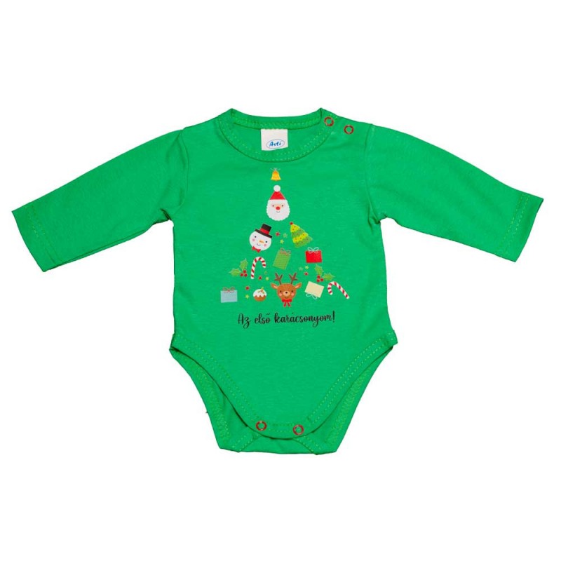 Hosszú ujjú baba body karácsonyi mintával Kisbabák ruhatárának praktikus alapdarabja a karácsonyi mintával díszített, hosszú ujjú baba body, ami tökéletes választás a hideg téli napokra Ez a cuki karácsonyi mintával nyomott baba body minőségi, bababarát 100% pamut anyagból készült, szín- és formatartó, ami jól bírja a gyakori mosást is. Vállán patentos, így megkönnyíti a baba öltöztetését. A lába közötti patentos megoldás, pedig a gyors peluscserét teszi lehetővé. Minőségi magyar termék Anyaga: 100% pamut Minőség: I. osztály A termék nikkelmentes patenttal készül. A patent nem tartalmaz nikkelt, ezért nem vált ki allergiás reakciót az erre érzékeny babáknál