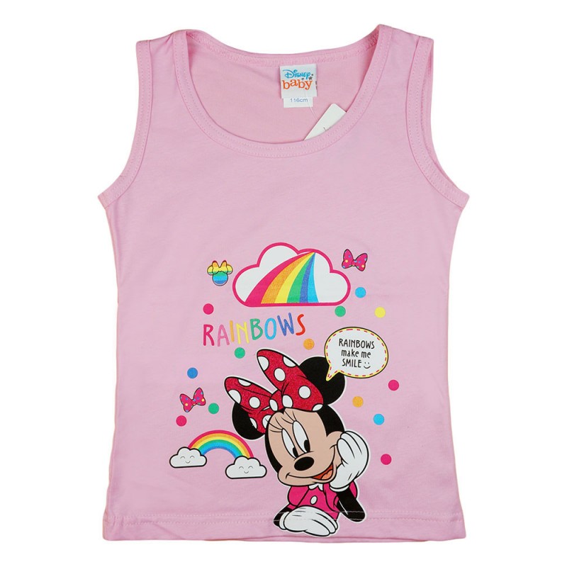 Bűbájos Minnie egér mintával díszített lányka trikó, amely a Disney hivatalos terméke. A friss és vidám szivárványos minta garantáltan feldobja a nyári napokat, a rózsaszín pedig igazi lányos hangulatot kölcsönöz a ruhadarabnak. Az ujjatlan design tökéletes választás a meleg nyári napokra. Minőségi magyar termék, mely 100% pamutból készült, így a kényelemről és a tartósságról egyaránt gondoskodik. Az I. osztályú minőség garantálja, hogy a trikó hosszú ideig megőrzi színét és formáját. A Minnie egér minta pedig minden kislány kedvence lesz.