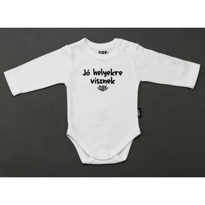 DRK "Jó helyekre visznek" mintával nyomott hosszú ujjú baba body Egy igazán vagány "Jó helyekre visznek" felirattal hívja fel magára a figyelmet ez a Dorkós baba body. A kisbabák komfortját szem előtt tartva készült, ennek megfelelően 100% pamutból szabták, ami puha, szín- és formatartó, emellett tökéletesen bírja a gyakori mosást is. Patentos kialakításának köszönhetően a vállánál könnyedén felvehető, míg a lába közötti patentok a gyors peluscserét teszik gyerekjátékká. Minőségi, nikkelmentes patentja biztosítja, hogy a legérzékenyebb bőrű babák sem szenvednek allergiás reakciókat. Ezzel a baba bodyval nem csak a kicsi öltözködését könnyítheted meg, de egyúttal a jövőjének alapjait is megteremtheted. Magyar minőség, amit érdemes megismerni! Minőségi magyar termék Anyaga: 100% pamut, Minőség: I. osztály