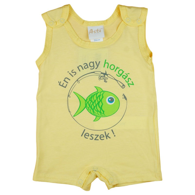 A "Én is nagy horgász leszek" feliratos ujjatlan napozó igazi nyári darab a kisfiúk számára. A vidám, sárga szín és a halacska minta garantáltan elvarázsolja a kicsiket és a szüleiket egyaránt. A vállon található patent megkönnyíti a fel-és levételt, így a kicsik is könnyedén belebújhatnak a napozóba. Minőségi magyar termék, mely 100% pamutból készült, biztosítva a kényelmet és a tartósságot. Az I. osztályú minőség jelzi, hogy a termék hosszú távon is megőrzi színét és formáját. Nem csak a szépsége, de az egészségügyi szempontokra való tekintettel is kiváló választás. A nikkelmentes patentoknak köszönhetően még az allergiára hajlamos babák is bátran viselhetik ezt a napozót. Öltöztesse kisfiát ezzel a napozóval és hadd legyen ő is a nyár legnagyobb horgásza!
