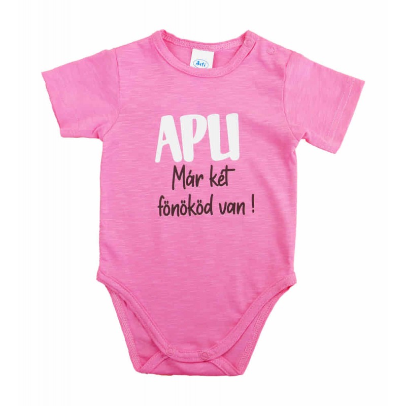 Feliratos rövid ujjú baba body Ezzel a vállon patentos, pink színű baba bodyval a kisbabád mindig stílusos lesz. A body feliratos, ami egyszerre vicces és aranyos. Az 100% pamut anyaga garantálja a kényelmet, és a nikkelmentes patentoknak köszönhetően nem kell aggódnod az allergiás reakciók miatt. Gondosan tervezett és készített termék, így biztos lehetsz benne, hogy a legjobbat kapod. A minőségi magyar termék, ami tökéletes választás minden unisex babáknak. Tökéletes választás, ha szeretnél egy igazán minőségi és kényelmes ruhadarabot a babádnak. Minőségi magyar termék Anyaga: 100% pamut, Minőség: I. osztály