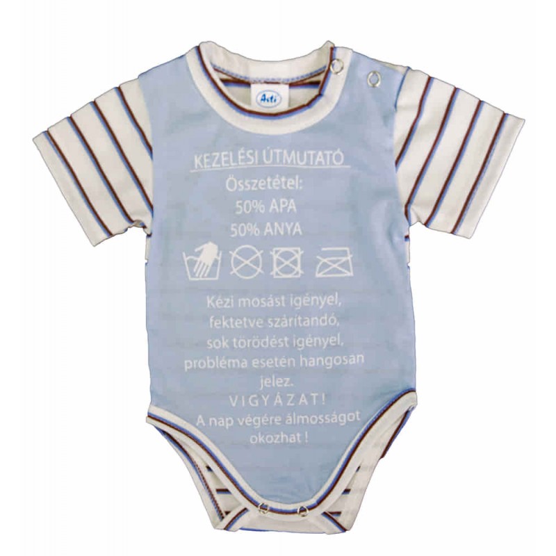 Egy igazi kényelmi darab ez a világoskék csíkos baba body, amely minden kisgyermek gardróbja számára elengedhetetlen. Unisex designja és a játékos felirat minden apróságnak örömöt okoz. A vállon található patentok megkönnyítik a fel- és levételt, így a pelenkázás sem lesz többé gond. Kiváló minőségű, 100% pamut anyaga biztosítja a bőrbarát, puha tapintást és a tartósságot. Az Andrea Kft. által Magyarországon készített termék, az I. osztályú minőséget garantál. Nikkelmentes patentjának köszönhetően, még az érzékeny bőrű babák számára is biztonságos, mivel nem okoz allergiás reakciót. Tegye komfortosabbá kisbabája mindennapjait ezzel a csodálatosan puha, pamut baba bodyval.