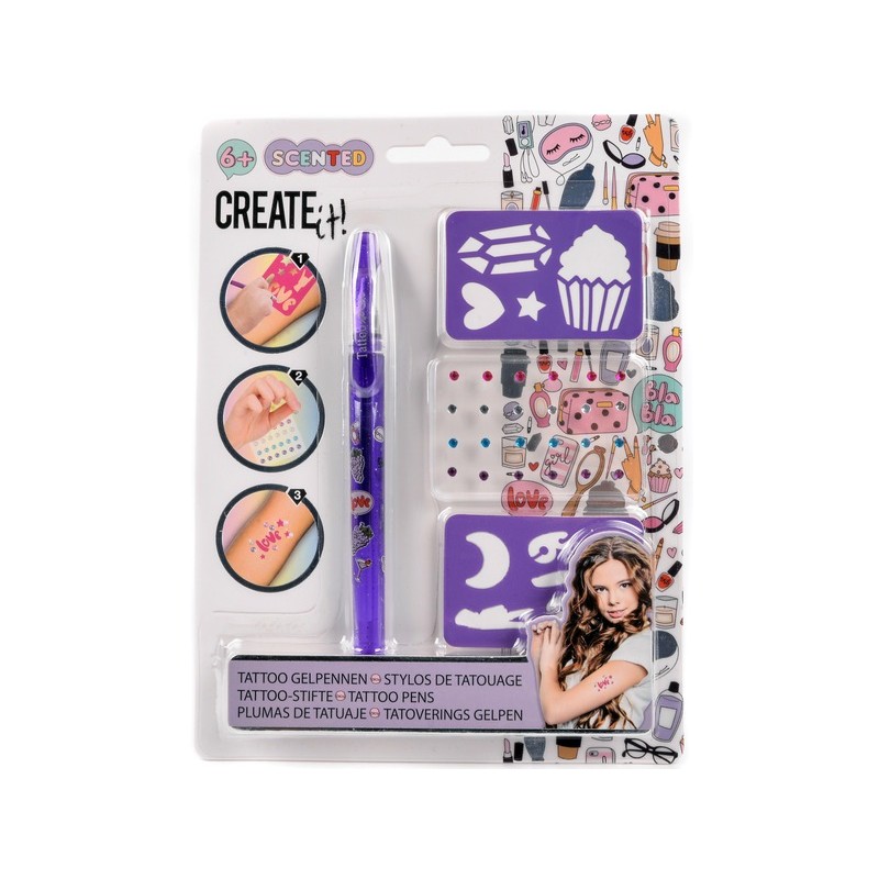 Dekoráld magadat illatozó ideiglenes tetoválásokkal! Az Illatos tetováló toll matricákkal csomagban csillámos tintával feltöltött, különleges zselés tollat találsz, amivel a bőrfelületre lehet szép tetkókat készíteni. A sablonokkal meg tudod adni, milyen legyen a minta, amit utána a tollal tudsz megrajzolni, és ékkövekkel is díszíthetsz. A tollak kellemes illatot árasztanak magukból, és ha meguntad a tetkót, könnyen le tudod mosni magadról. Az Illatos tetováló toll matricákkal készlet 1 darab tollat, valamint sablonokat, díszítő elemeket is magában foglal. Csomagolás méretei: 15 x 21 cm. A játékok külön kaphatóak. A megjegyzésben kérjük tüntesd fel, hogy melyik változatot szeretnéd!