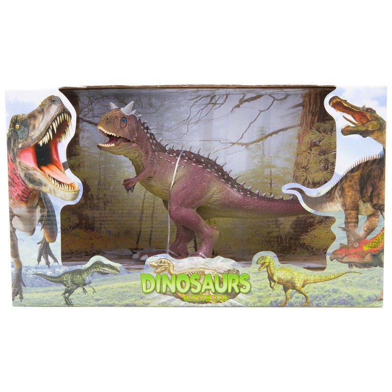 Játszd el az őskor kalandjait egy félelmetes dínóval! A Dinoszaurusz játékkészlet figurával csomagban egy színes műanyagból készült ijesztő dínót találsz, hosszú karmokkal, éles fogakkal. A dínó fején szarvakat találsz, a készletet együtt tudod használni más dinoszaurusz játékkészletekkel is. A dobozt háttérként is használhatod, a belseje őskori környezetet ábrázol. A dínó mérete: 20 cm.
