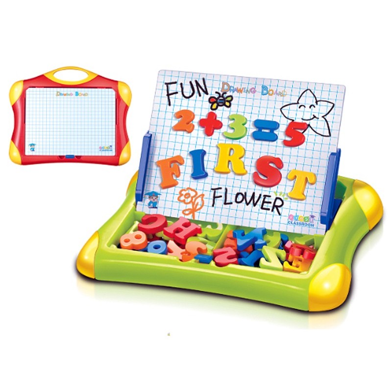 Számolj a táblán, rajzolj és ismerd meg a matematikai műveleteket! A Mágneses rajztábla kerettel és számokkal készletben lévő táblát ki tudod támasztani, a tábla fényes felületére filctollal tudsz rajzolni. A rajzokat szivaccsal lehet letörölni. Ha megfordítod a táblát, egy mágneses, krétával rajzolható felület tárul eléd. A csomagban találsz egy szám és műveleti jel készletet is, amivel a számolást tudod gyakorolni. A sablonokat tedd fel a táblára és írd alá, hogy miből mennyi van rajta. A Mágneses rajztábla kerettel és számokkal készlet 22 db képet és 45 db mágneses nagybetűt tartalmaz. Csomagolás méretei: 30 x 24 x 4 cm.