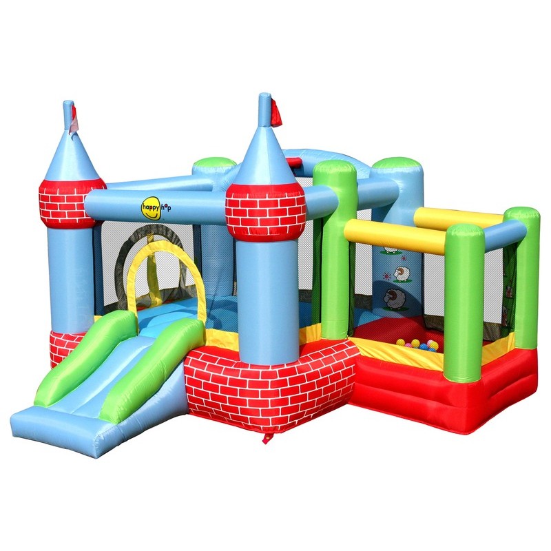 Kastély formájú ugárlóvár tornyokkal, és labda medencével! A Kastély ugrálóvár labdahálóval egy nagy méretű, erős PVC-ből készült vár, amiben több gyerek tud ugrálni, és játszani. Az ugrálóvárból csúszdán keresztül lehet kijutni, az oldalsó hálós részt kicsi labdákkal érdemes feltölteni, ami külön élményt nyújt a gyerekeknek. A kültéri Kastély ugrálóvár labdahálóval kompresszorral fújható fel, amit a készlet magában foglal. Az ugrálóvár felfújt méretei: 325 x 300 x 220 cm.