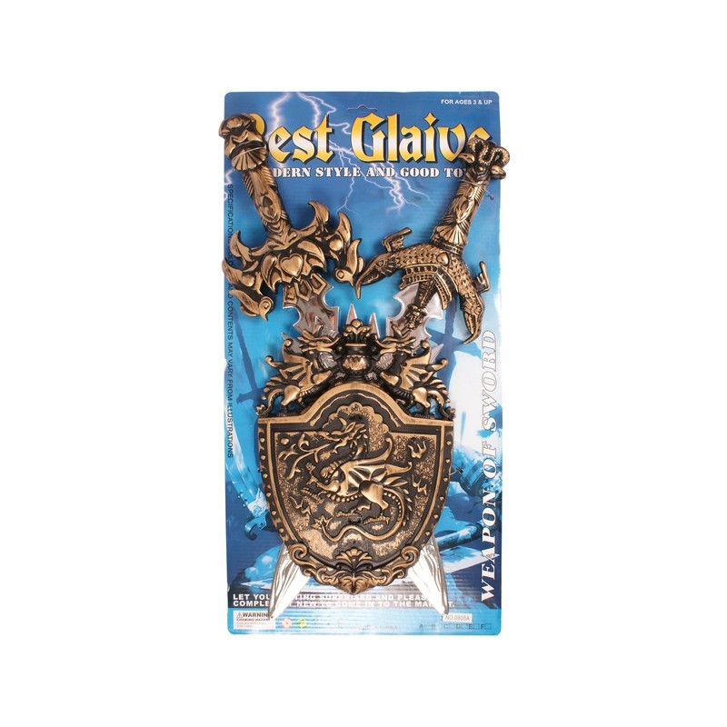 Vívd meg a lovagok csatáját kardokkal és pajzzsal! A Kard és pajzs készlet műanyagból készült, bármilyen lovagi jelmez tökéletes kiegészítője! A kardok antikolt bronz és ezüst színűek, a fegyverek puhább műanyagból készültek, ezért nem tudsz velük sérülést okozni. Kardok mérete: 55 cm, pajzs méretei: 20 x 29 cm.