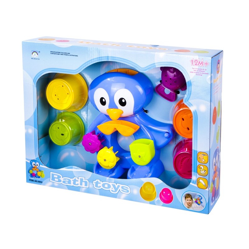 Pancsolj együtt a lubickoló pingvin fürdőjátékkal! A Lubickoló pingvin műanyagból készült, megtapad a csempén vagy a fürdőkád falán is! A vödrökkel öntsd be a fején a vizet, ami vagy a malomkerekekre, vagy a tartályba fog folyni. A pingvin nyakkendője billeg, a pingvin és a vödrök tengeri állatokkal vannak díszítve. A Lubickoló pingvin fürdőjáték segít megérteni az ok-okozati összefüggéseket, fejleszti a kézügyességet és élménnyé teszi a gyerekeknek a fürdést, amit gyakran nem szeretnek. Pingvin méretei: 22 x 8 x 23 cm.