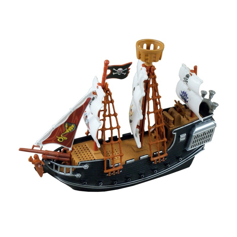 Irány a tenger a kalózokkal, rabold végig az összes kikötőt! A kalózhajó műanyagból készült a fiatal kalózok számára! A hajó orrát egy szobor díszíti, a vitorlákon félelmetes minták ijesztgetik a békés hajósokat. Forgasd el a hajó kormányát, ha szeretnél irányt változtatni, az ágyúkkal bármilyen erős hadihajót el tudsz süllyeszteni. Csatlakozz a kincskereső kalózokhoz, és illeszd be a hajót más kalóz készletekbe is! Hajó méretei: 25 x 8 x 19 cm.