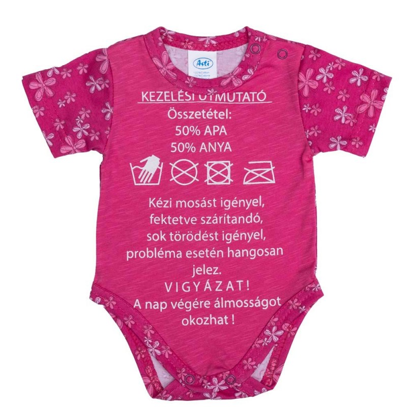 Feliratos rövid ujjú baba body Ezzel a vállon patentos, pink virágos baba bodyval a kisbabád mindig stílusos lesz. A body feliratos, ami egyszerre vicces és aranyos. Az 100% pamut anyaga garantálja a kényelmet, és a nikkelmentes patentoknak köszönhetően nem kell aggódnod az allergiás reakciók miatt. Gondosan tervezett és készített termék, így biztos lehetsz benne, hogy a legjobbat kapod. A minőségi magyar termék, ami tökéletes választás minden unisex babáknak. Tökéletes választás, ha szeretnél egy igazán minőségi és kényelmes ruhadarabot a babádnak. Minőségi magyar termék Anyaga: 100% pamut, Minőség: I. osztály