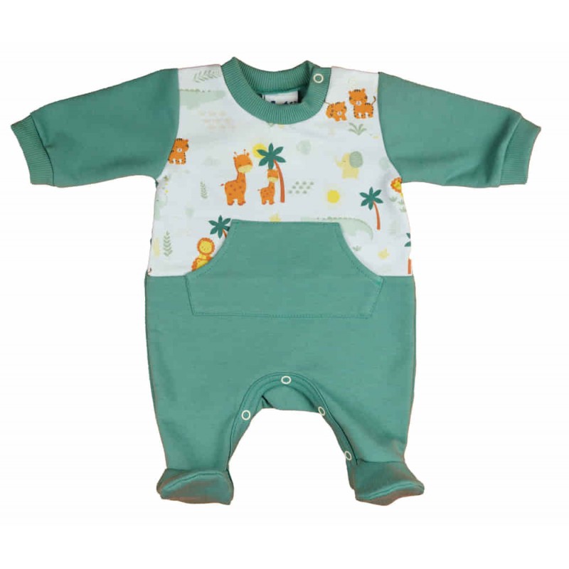 Fedezd fel a dzsungel varázslatos világát ezzel a gyönyörű, szafaris mintával díszített rugdalózóval! A belül bolyhos kialakításnak köszönhetően kisbabád garantáltan melegen és kényelmesen érzi majd magát, akár egész nap. A vállon található, nikkelmentes patentok megkönnyítik az öltöztetést, és nem okoznak allergiás reakciót az érzékeny bőrű babáknál. A rugdalózó praktikus kenguruzsebbel is rendelkezik, amely további kényelmet biztosít. A 65% pamut és 35% poliészter összetétel garantálja a tartósságot és a kényelmes viseletet. Büszkék vagyunk rá, hogy ez a termék minőségi magyar termék - válaszd Te is a hazai minőséget!