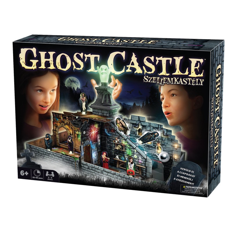 Szellemkastély társasjáték Játékosok száma: 2-6 játékos, Korosztály: 6 éves kortól ajánlott, Játékidő: 25-40 perc. Hosszú évek síri csendje után a Szellemkastélyból újra kísérteties hangok hallatszanak. Az elátkozott épület kapui újra feltárultak, bátor hősöket csábítva, hogy megküzdjenek a gonosz lidércekkel. A nagy sikerű és közkedvelt Szellemkastély társasjáték végre újra kapható! A Szellemkastély egy izgalmas és rendkívül látványos gyerek- és családi játék. A kaland során a Szellemkastély szobáit kell bejárniuk a játékosoknak, akik szakértők a paranomális tevékenységek felderítésében. Sok szóbeszéd jár a kastélyról és az ott kísértő szellemekről és mind igaz, az utolsó szóig! Ahogy a torony irányába haladva aktiváltátok csapdák tömegét, a gonosz szellem felébredt évtizedes álmából, és most bosszúra szomjazik! Irány a lépcső, kalandorok, de ne feledkezzetek meg kelepcékről sem! A játéktér összeállítása ugyan igényelhet némi szülői segítséget, valamint pár perc előkészülést, de az asztalról kiemelkedő, 3D-s kastély, és a játék során mechanikusan működő csapdák mindenért kárpótolnak majd!