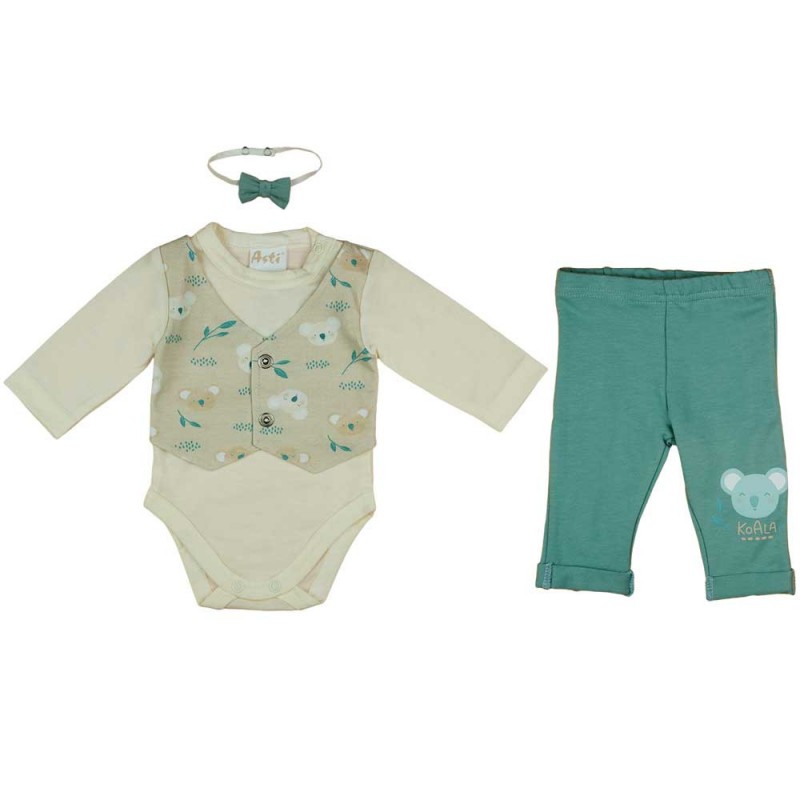 Vigyen haza egy kis Ausztráliát a picijének ezzel a 3 részes, koalás mintás babaszettel! Az összeállítás hosszú ujjú, mellényes baba bodyból áll, amelyen a kedves koalák mosolyognak ránk. Az összeállítást a hozzá illő, gumis derekú babanadrág és állítható patentos baba csokornyakkendő egészíti ki. A zöld színű szett igazán vidámmá teszi a hideg, téli napokat is. A minőségi magyar termék 100% pamutból készült, ami kényelmes és gyengéd a bőrhöz. Az I. osztályú minőségű termék nikkelmentes patenttal készül, így az érzékeny bőrű babákra is gondoltunk. Az Andrea Kft. gondosan figyelt a részletekre, hogy a kisbabája a lehető legnagyobb kényelemben és biztonságban legyen.