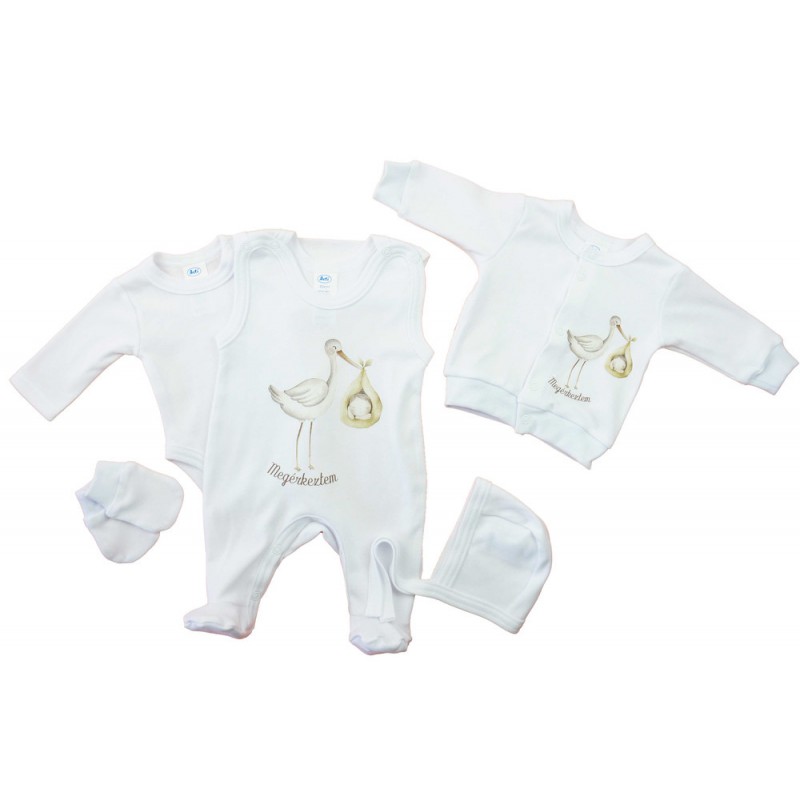 5 részes baba szett gólyás mintával A szettben található egy cuki ujjatlan rugdalózó, melynek vállán praktikus patent segíti az öltöztetést, valamint a mintáját egy friss és vidám gólyás minta díszíti. Ezenkívül a csomag tartalmaz egy kényelmes, hosszú ujjú bababody-t is, mely szintén vállon patentos kialakítású. Továbbá egy elöl patentos kocsikabátot is találunk a szettben, melyen szintén a vidám gólyás minta kapott helyet. De a csomag még nem ért véget! Egy aranyos baba sapkát és egy pár babakesztyűt is talál benne, hogy a kicsi feje és keze is mindig meleg legyen. Az összes termékben nikkelmentes patentokat használtunk, így azok nem váltanak ki allergiás reakciókat az erre érzékeny babáknál. Válassza ezt a minőségi, I. osztályú magyar terméket, hogy babája mindig stílusos és kényelmes legyen!