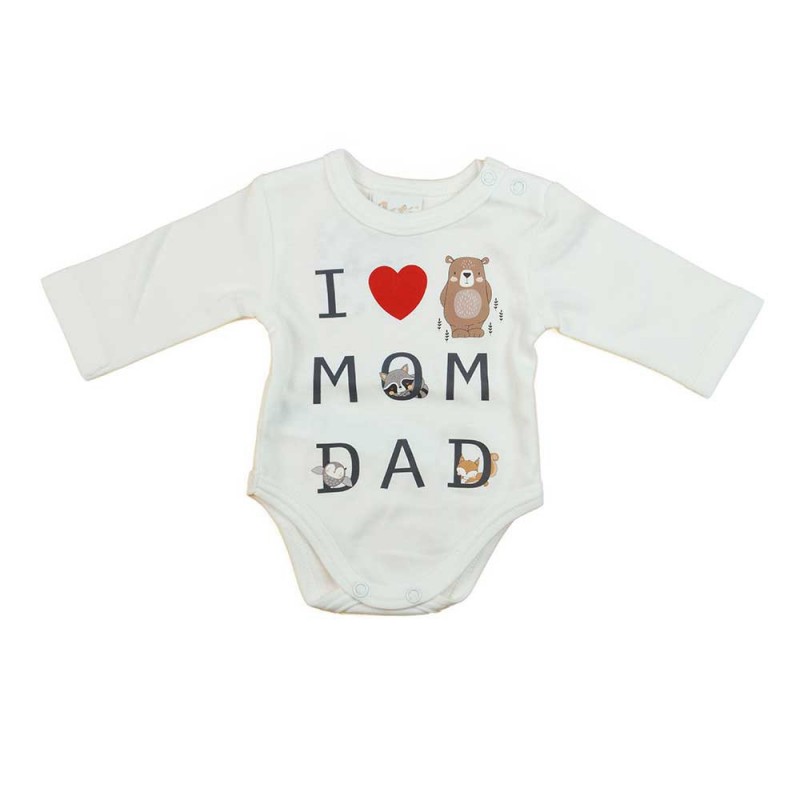 Az Ön kisbabájának ruhatárában nélkülözhetetlen ez a hosszú ujjú, feliratos baba body. "I love mom and dad" felirattal díszített, ez a darab nem csak cuki, de kényelmes is. A 100% pamut anyag biztosítja a puhaságot és a kényelmet, míg a szín- és formatartó tulajdonságok révén hosszú távon is megőrzi minőségét, még a gyakori mosások után is. A vállán lévő patentok segítenek a könnyű öltözködésben, míg a lába közötti patentok a gyors peluscserét teszik lehetővé. Ez a minőségi magyar termék I. osztályú, nikkelmentes patenttal készült, hogy megóvja a nikkelre érzékeny babák bőrét az allergiás reakcióktól. Tegye boldoggá kisbabáját ezzel a gyönyörű és praktikus bababodyval!
