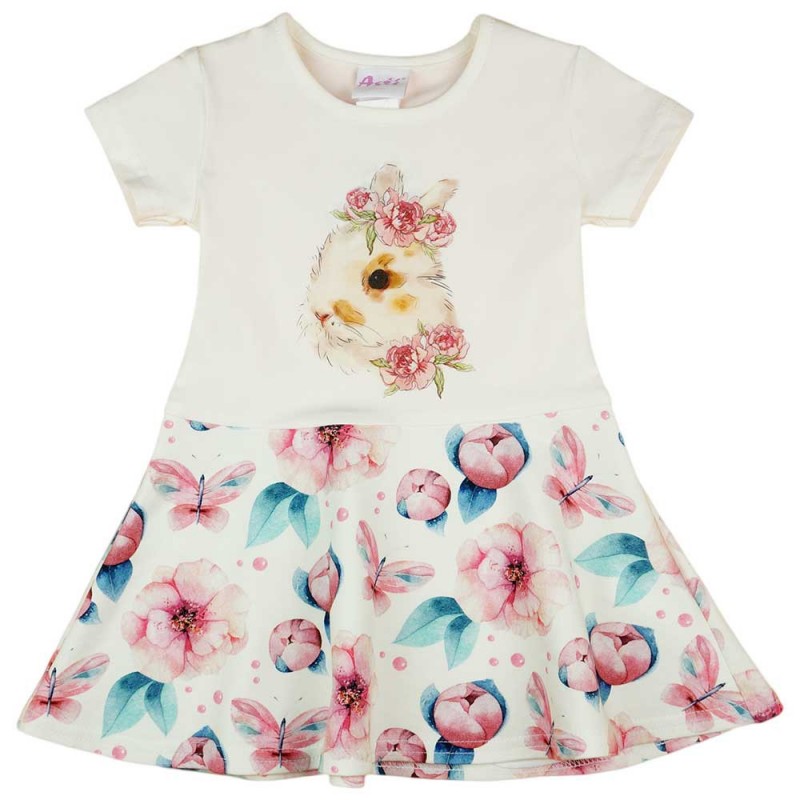Nyuszis mintával nyomott, rövid ujjú, elasztikus pamut lányka ruha.