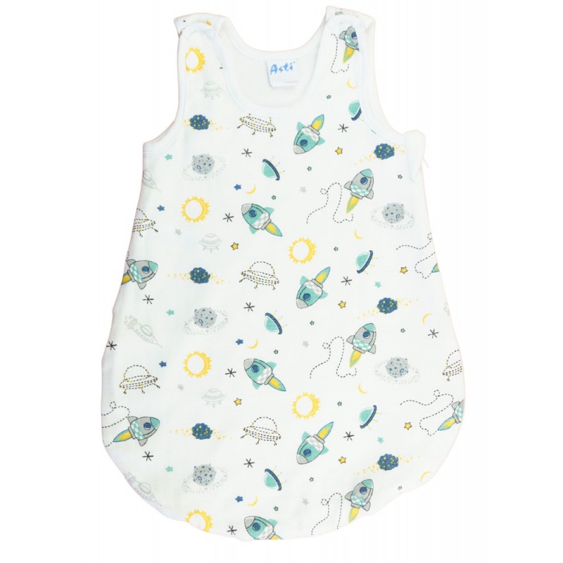 Ujjatlan vékony tetra hálózsák Ürhajós mintával 1 TOG Öltöztesse álomba kisbabáját ebben az ürhajó mintás, ujjatlan hálózsákban! Az oldalt cipzáras, vállon patentos kialakításnak köszönhetően könnyedén felvehető és levehető, így az éjszakai pelenkázás sem lesz gond. A hálózsák 100% pamut tetra anyagból készült, ami puha érintésű és légáteresztő, így a baba éjjel-nappal kényelmesen és biztonságosan tud majd aludni. A minőségi magyar termék érzékeny bőrű babák számára is ideális, hiszen nikkelmentes patenttal készült, ami nem vált ki allergiás reakciót. A 1 TOG értékű hálózsák tökéletes választás melegebb hónapokra. Segítünk a választásban: táblázatunk segítségével könnyedén kiválaszthatja a megfelelő hálózsákot az évszaktól és a hőmérséklettől függően.